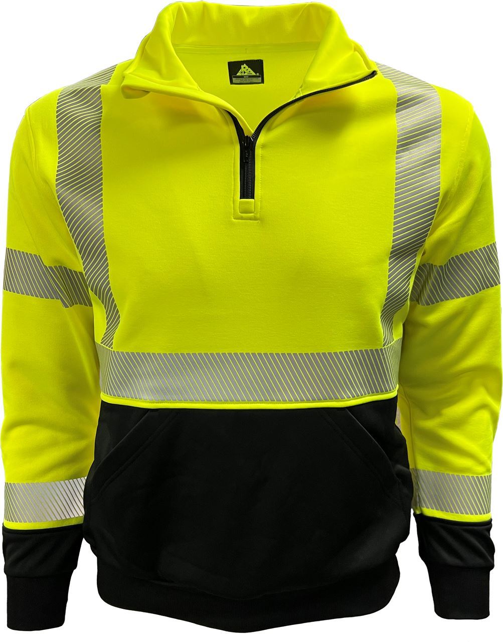 These ANSI III Compliant Sweatshirts are 100% polyester knitted microfiber fleece that weighs 7 oz. The YKK® quarter zip sweatshirt has two large hand warmer pockets for warming hands on chilly mornings. It has a lime and navy color block with a navy funnel collar and rib knit navy cuffs and bottom.